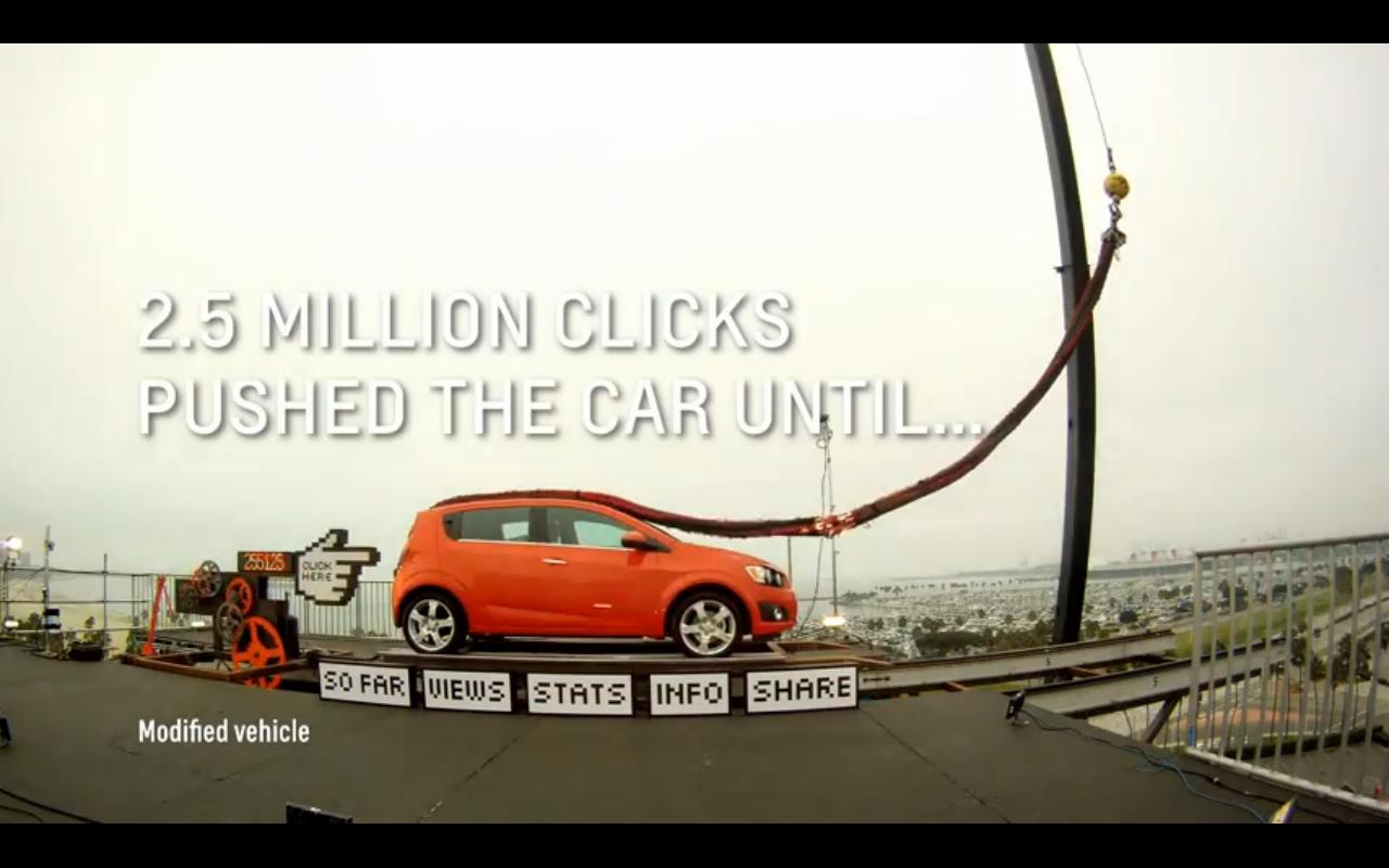 Através de um website (já desactivado) http://letsdothis.com as pessoas eram convidadas a clicarem num botão. Quando fossem dados 2,5 milhões de cliques o carro seria lançado da torre indo em direcção a uma piscina cheia de água.